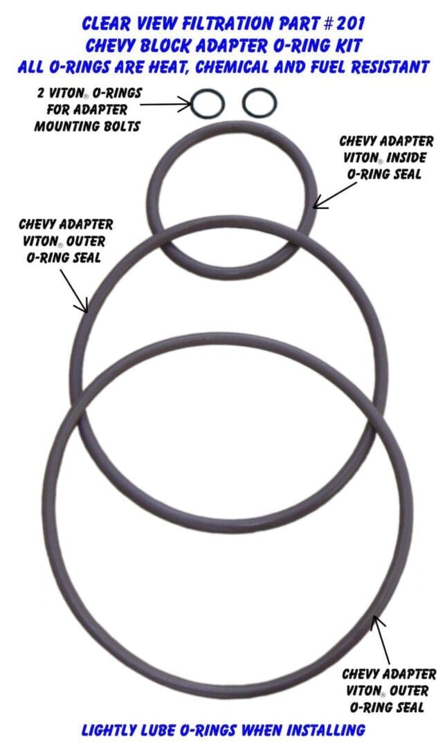 Chevy Block Adapter Replacement O-Ring Kit fits Clear View Chevy Part # 200 Adapter. Consists of three O-Rings for Block Adapter and two O-Rings for Mounting Bolts that are made of VitonĀ® which is chemical and fuel resistant.