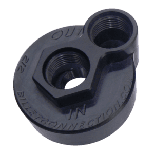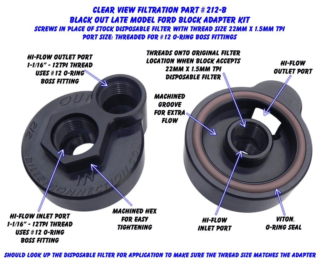 Late Model Ford Block Adapters Screw onto the Engine Block where the Stock Disposable Filter usually goes with Disposable Oil Filter Thread Size of 13/16″ X 16 TPI. Adapters are offered in either Clear or Black anodized.