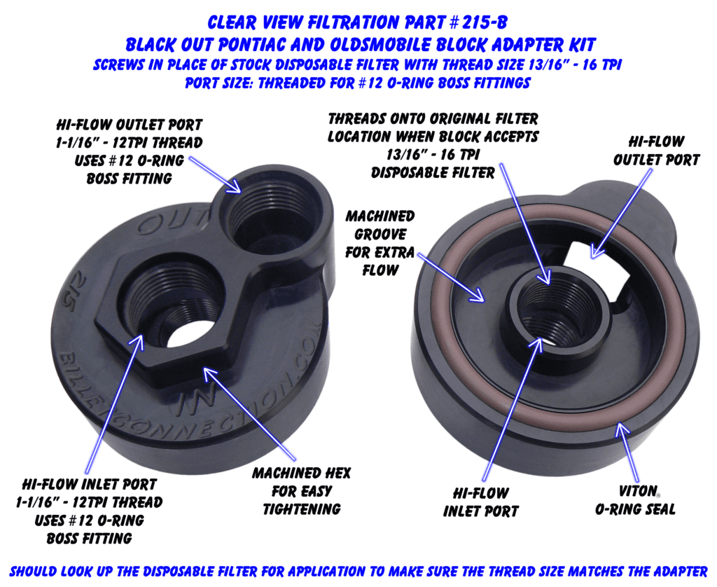 Pontiac & Oldsmobile Block Adapters Screw onto the Engine Block where the Stock Disposable Filter usually goes with Disposable Oil Filter Thread Size of 13/16″ X 16 TPI. Adapters are offered in either Clear or Black anodized.