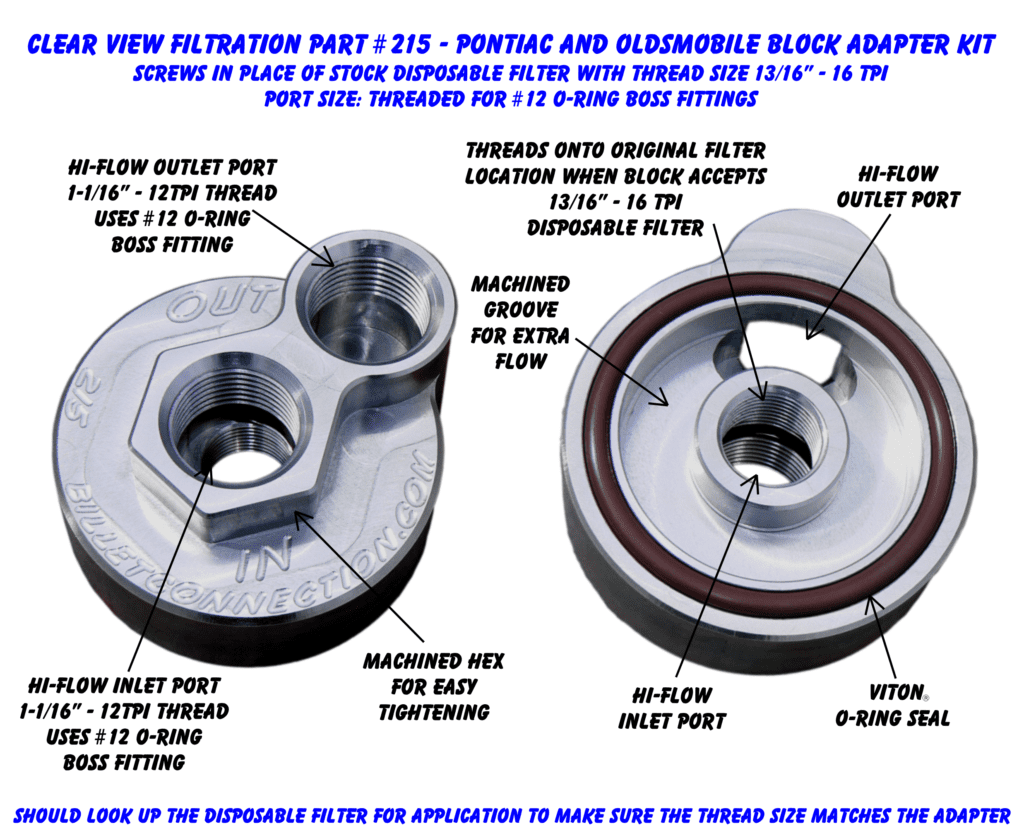 Clear View Filtration’s Pontiac and Oldsmobile Block Adapter Kit are designed for high flow without restrictions. This adapter screws onto the block where the stock disposable filter usually goes. Kit comes with Viton® O-Ring.