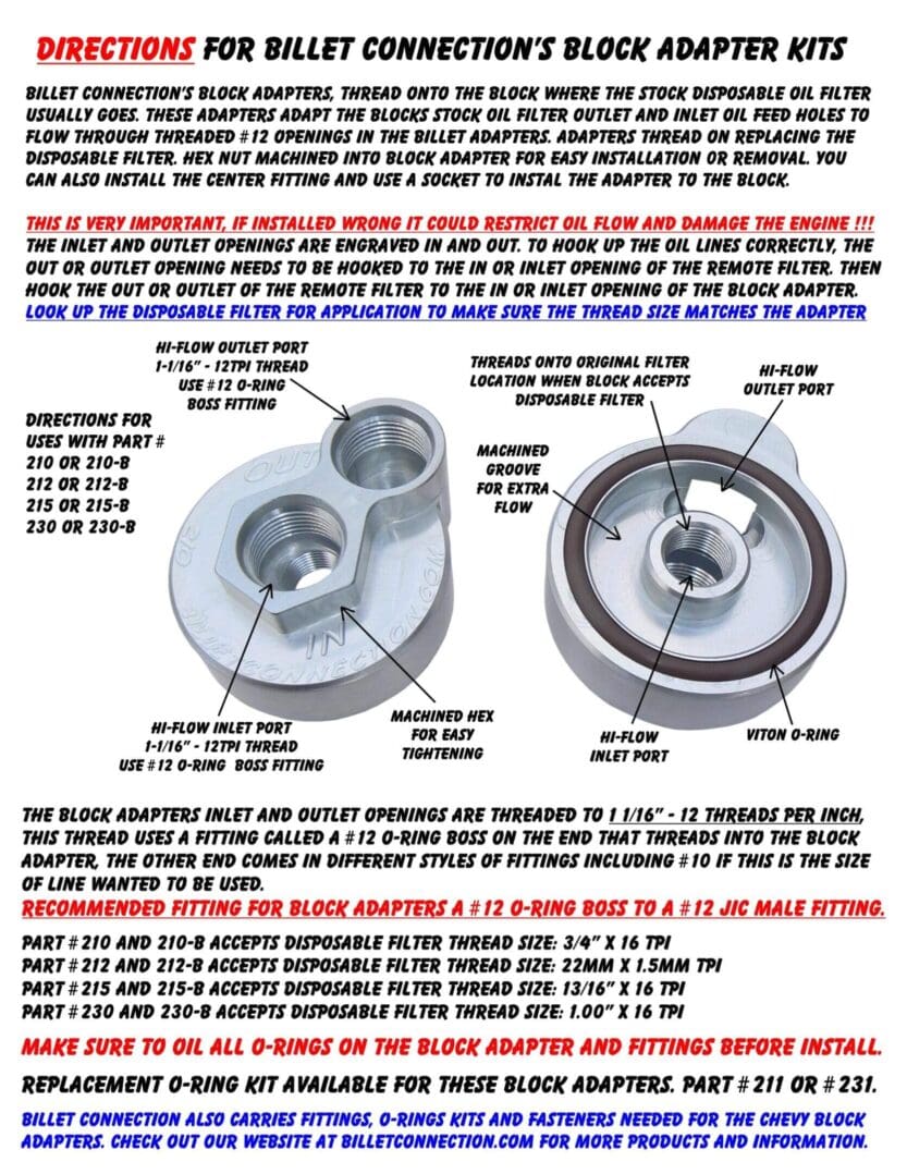 Description: Cummins Diesel Block Adapters screw on where the stock disposable filters usually goon the block. Block adapter Ports are threaded for #12 O-Ring boss fittings. Block Adapters are engraved which Port is In and Out to help with install. Block adapters are plumbed with the Out Port of the block adapter to the In Port of the remote filter. The Out Port of the filter goes to the In Port of the block adapter. Also can work with Dry Sump setups by plugging the Outlet Port of the block adapter and just using the Inlet Port. Block Adapter Kits come with a Viton® sealing O-Ring. Cummins Diesel Replacement Block Adapter O-Ring Kit is Part # 231. Block adapters can fit more makes and models than listed. Check which disposable filter fits the application and compare thread and seal specs.