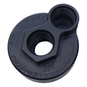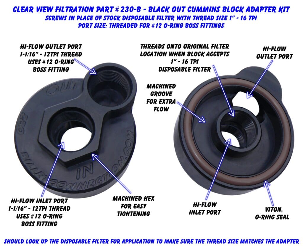 Cummins Block Adapters Screw onto the Engine Block where the Stock Disposable Filter usually goes with Disposable Oil Filter Thread Size of 1.00″ x 16 TPI. Adapters are offered in either Clear or Black anodized.