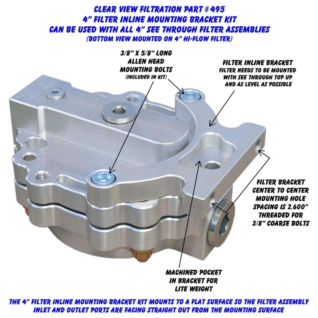 This 4” Filter Inline Mounting Bracket Kit. Can be used with all 4” Hi-Flow, Dry-Sump and Screw-On See Through Filter Assemblies. Mounts filter inline with mounting surface and ports.